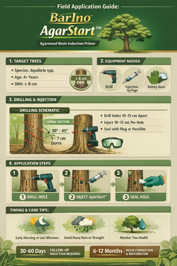 BarIno™ AgarStart™ is an early-stage agarwood induction primer designed to ignite the resin formation process in Aquilaria trees using a controlled, low-damage biochemical approach.